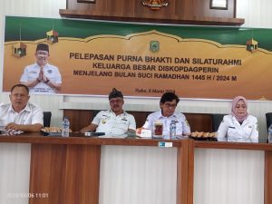 CIGANDAMEKAR. Kepala Dinas Koperasi UKM Perdagangan dan Perindustrian (DISKOPDAGPERIN) Kabupaten Kuningan, Trisman Supriatna, S.Pd., M.Pd. melepas Kepala Bidang Koperasi, H. Nono Supriatna, S.Sos., M.Si. yang memasuki purna bhakti, dan alih tugas 2 orang pegawai yang dilaksanakan di Kantor Pusat Layanan Usaha Terpadu (PLUT) KUMKM, hari ini Rabu, 6 Maret 2024.